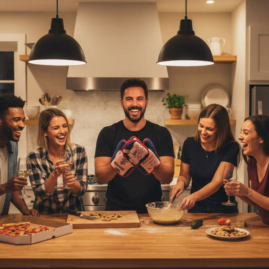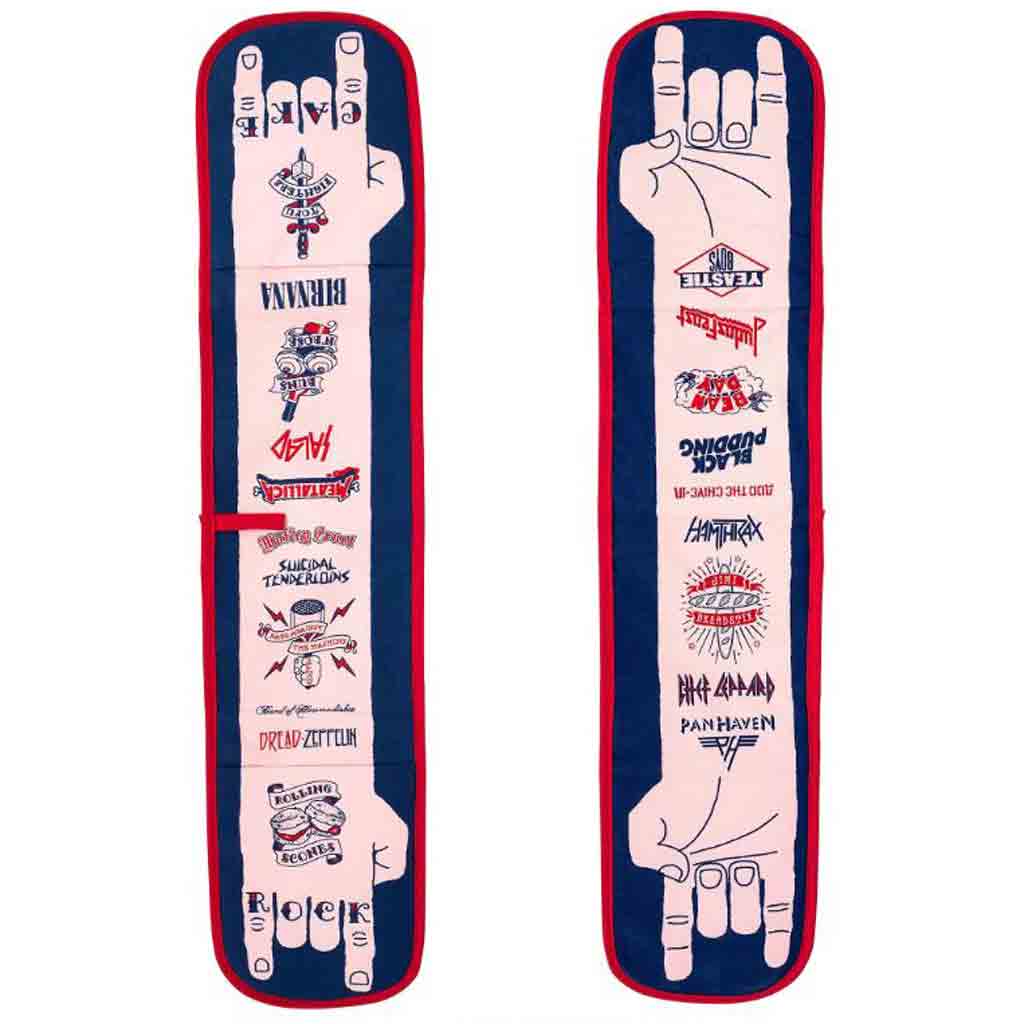 These fantastic gloves offer a fun tribute to rock bands of the ages with a baking twist! Van Halen? Nope it's Pan Halen. How about Meatallica?