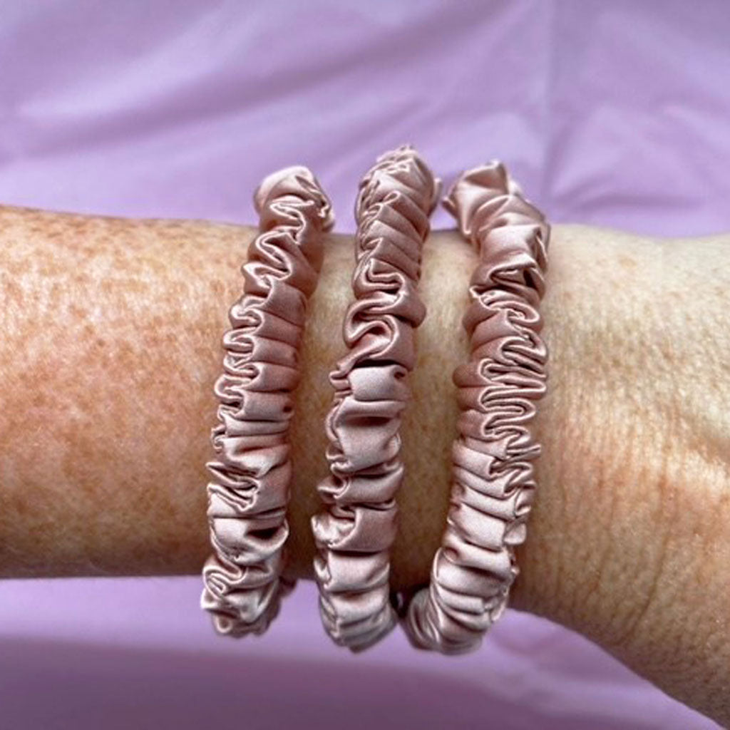 This gorgeous silk scrunchie delivers zero hair snags for maximum comfort and minimal friction. With their skinny design they're perfect for wrapping around your hair 2-3 times depending on your hair thickness. It looks amazing on the wrist and is a must have daily essential for your hair!