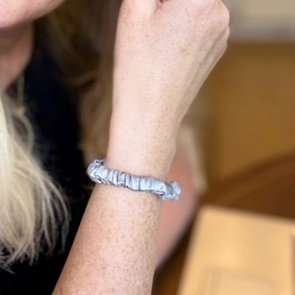 Indulge your hair in luxury Grade 6A Mulberry silk with our skinny silver silk scrunchie delivered in a cute mesh drawstring bag.