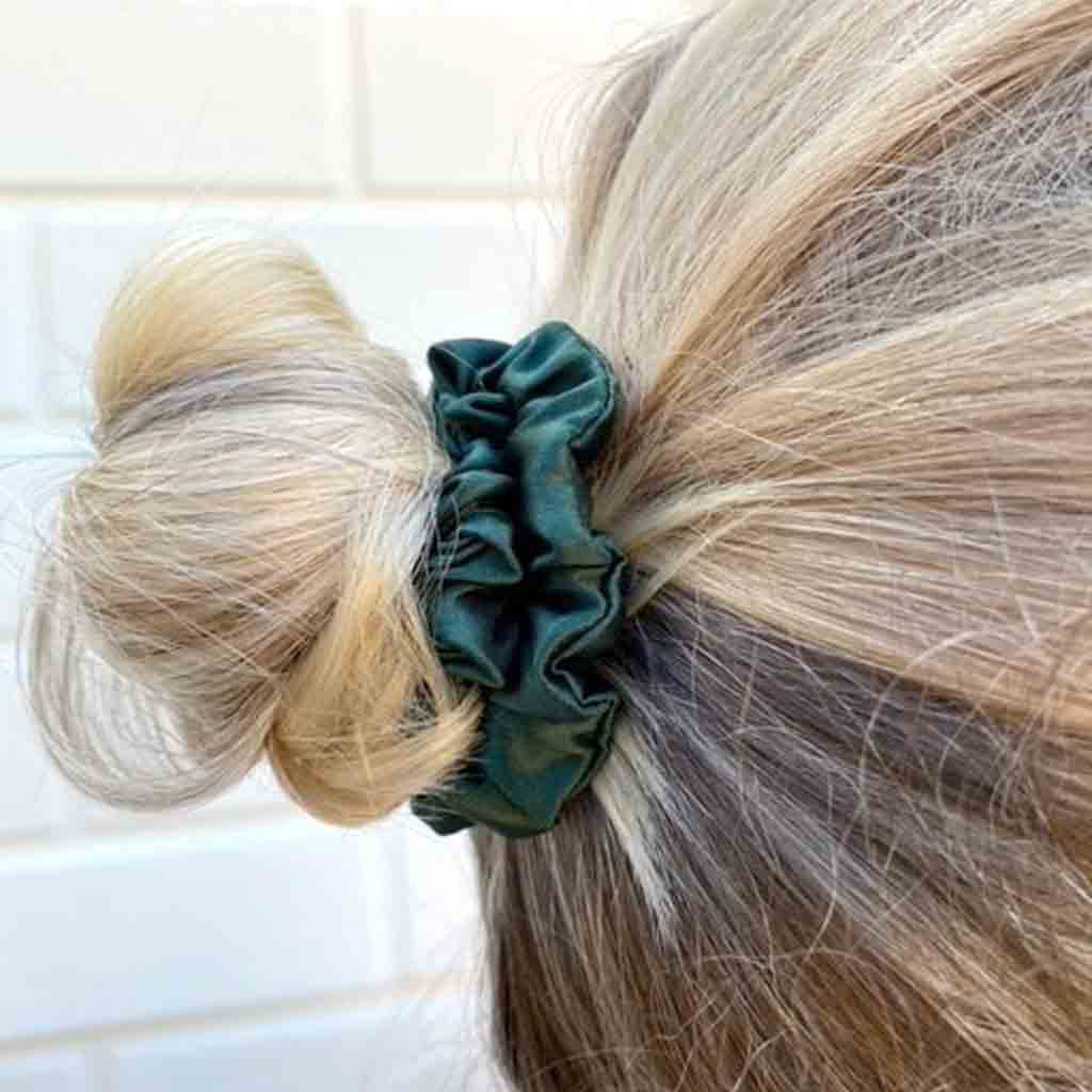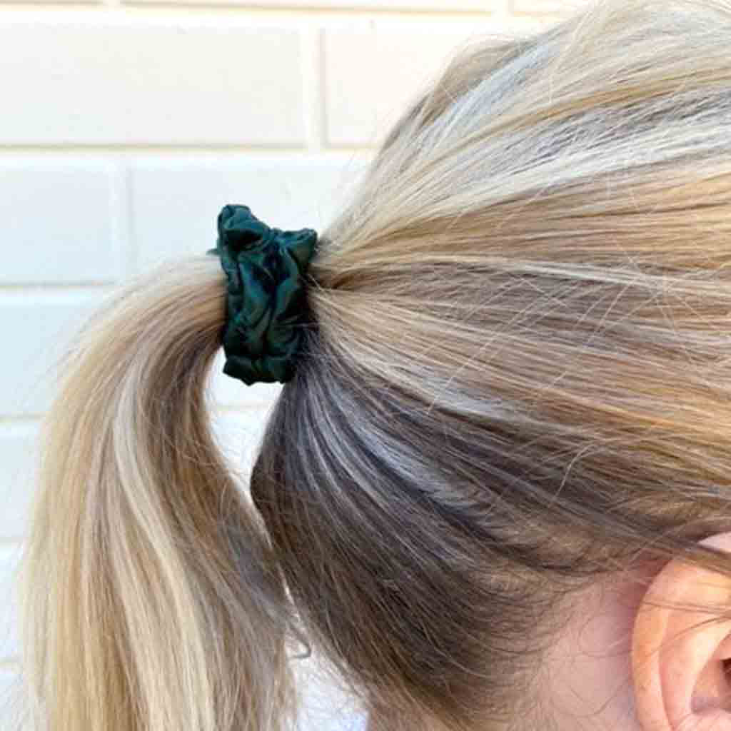 Indulge your hair in luxury Grade 6A Mulberry silk with our slender emerald green silk scrunchie delivered in a cute mesh drawstring bag.