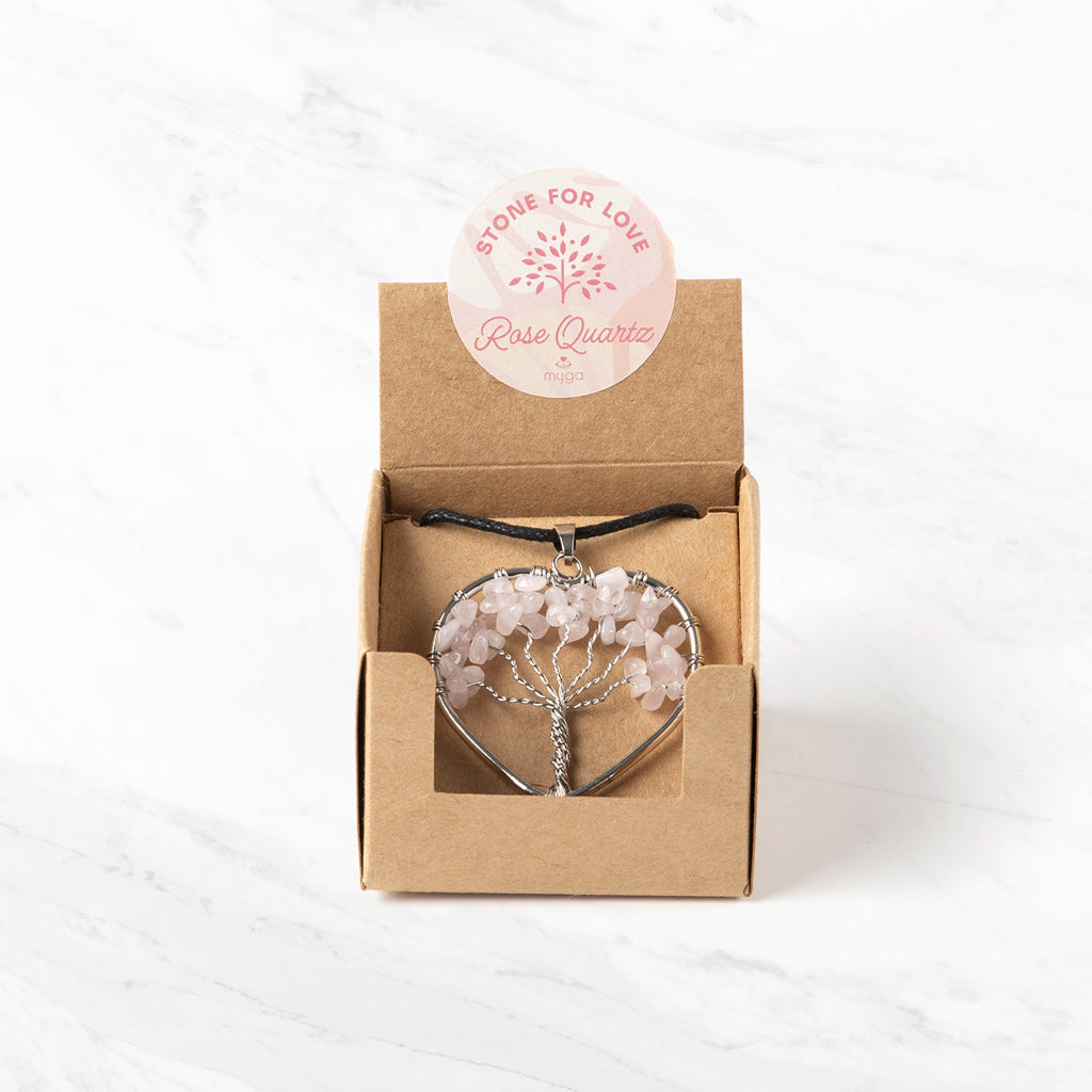 Tree of Life Crystal Pendant Heart Necklace | Rose Quartz